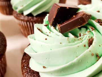 Rich Chocolate cupcake with a Mint Chocolate Ganache center topped with Mint Buttercream and Mint Chocolate Candy.