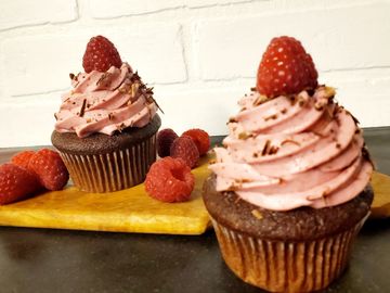 Rich chocolate cupcake filled with raspberry chocolate ganache, topped with fresh raspberry buttercream, chocolate shavings, finished with fresh raspberries