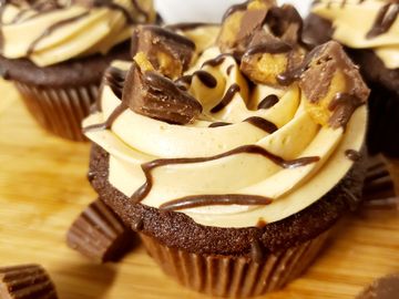 Rich chocolate cupcake filled with chocolate peanut butter ganache, topped with creamy peanut butter buttercream, mini peanut butter cup crumbles and drizzled with chocolate