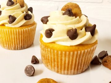 Vanilla cupcake flilled with chocolate chip cookie dough, topped with cookie dough buttercream, a chocolate chip cookie and sprinkled with chocolate chips