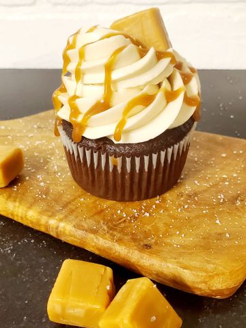 Our rich chocolate cupcake with a salted caramel center topped with caramel buttercream and drizzled with even more salted caramel sauce!