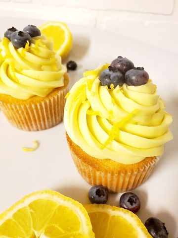 Delicate lemon cake filled with blueberry compote topped with lemon buttercream and fresh blueberries.